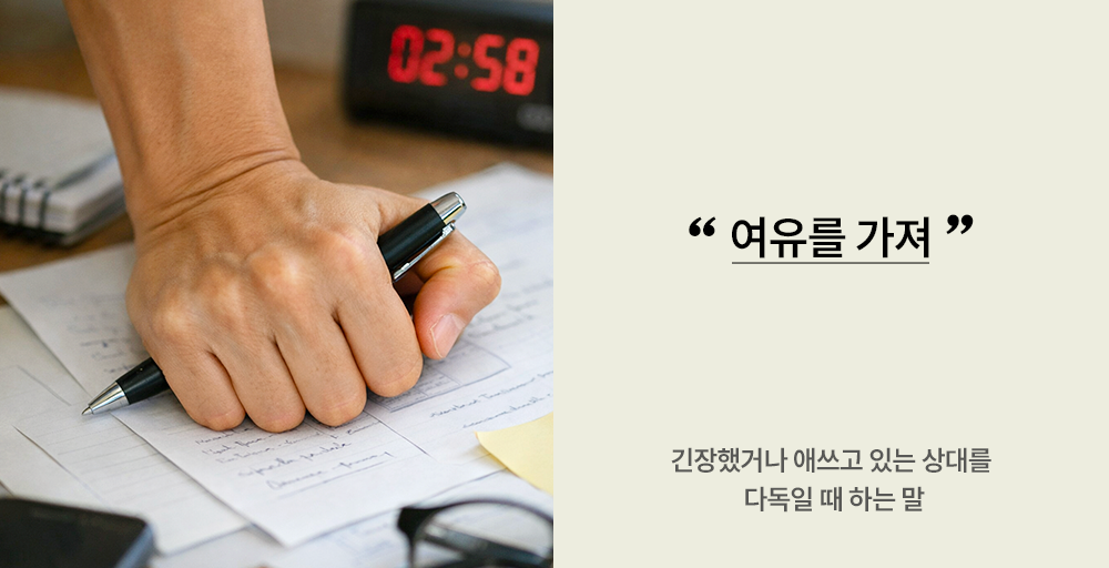 마감이 코앞이거나 결과를 앞두고 긴장했을 때, 누군가 유난히 애쓰고 있을 때 우리는 종종 이런 말을 던집니다. “여유를 가져.” 비슷한 표현으로는 “힘 빼”가 있습니다. 이미 충분히 잘하고 있으니, 너무 애쓰지 말고 힘을 좀 빼고 여유를 가져보라는 마음을 담아 건네는 말입니다.