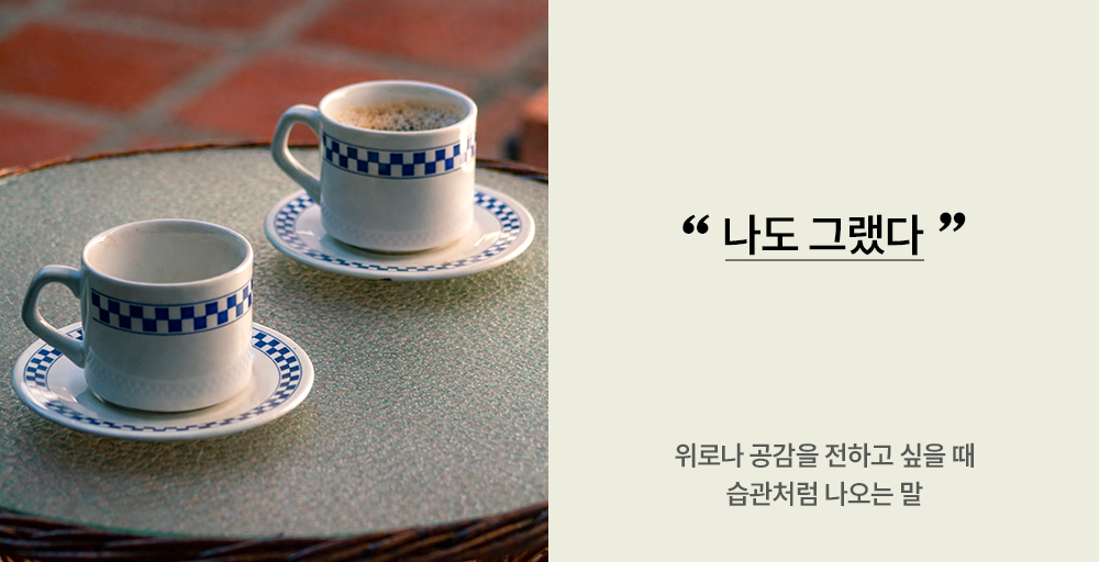 친구가 내가 겪었던 일과 비슷한 고민을 털어놓으면, 우리는 으레 “나도 그랬다”는 말을 먼저 하게 됩니다. ‘나도 그런 일을 겪었고, 비슷한 감정을 지나왔기에 네가 지금 어떤 마음일지 짐작할 수 있다’는 뜻을 담아, 위로나 공감의 마음을 전하고자 할 때 건네곤 해요. “나도 그랬다”는 말에는 나 역시 잘 버텨왔으니 상대 역시 잘 버텨낼 것이라 믿는 다정한 신뢰가 담겨 있습니다.
