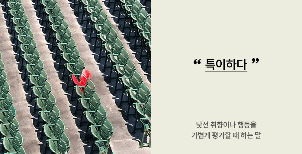 ‘특이하다’는 말을 사전에서 찾아보면 ‘보통 것이나 보통 상태에 비하여 두드러지게 다르다.’는 뜻이라고 합니다. 나에게 익숙하지 않은 취향이나 선택, 행동 등을 보면 ‘특이하네’라고 말하게 돼요. 약간의 호기심과 가벼운 감탄, 신기함을 한데 섞은 표현입니다. 이 말을 건넬 때의 의도에는 대개 악의가 없습니다. 놀라움의 표현이나 친근함의 표시, 때로는 분위기를 풀기 위한 농담처럼 쓰이기도 합니다.