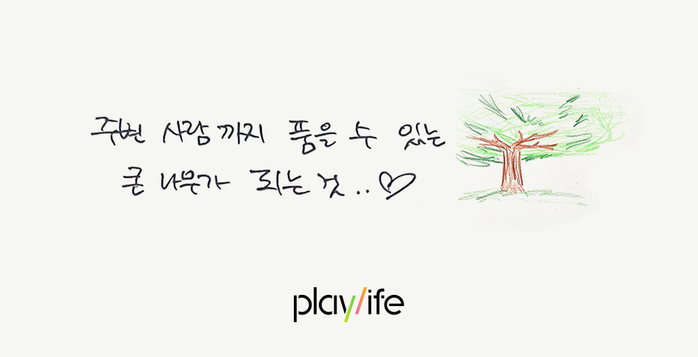 마음이 성장한다는 건 경험이 쌓인다는 뜻 같아요. 좀 무던해지는, 자잘한 일에도 일희일비한다고 하잖아요. 마음이 덜 자라 있던 시절에는 슬픔이나 좌절이 더 크게 다가왔던 것 같아요. 지금은 감정이나 자극에 좀 무던해졌어요. 물론, 아직도 마음은 성장 중이고 더 배워야 할 게 많다고 생각해요. ‘자신과 주변 사람들까지 품을 수 있는 나무 같은 사람’이 되면, 마음이 한단계 더 성장했다고 느낄 것 같아요.