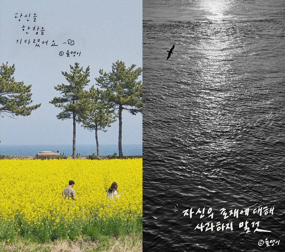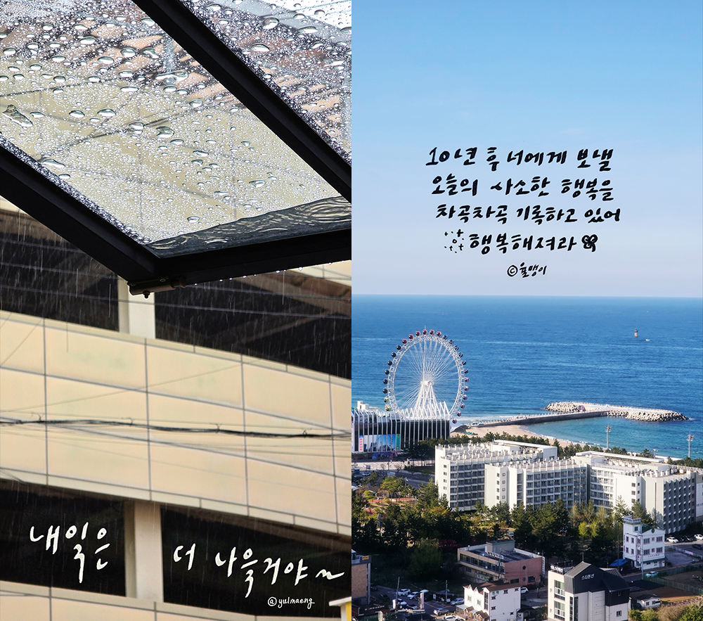 이번 워크숍에서 기대한 건 딱 하나, 나만의 손글씨로 누군가에게 작은 위로를 건넬 수 있는 사람이 되고 싶었어요. 그런데 붓펜으로 글씨를 쓰는 건 생각보다 훨씬 어렵더라고요.(웃음) 모조지에 연습하다가 붓펜이 많이 갈라지기도 했고, 글씨를 빠르게 쓰다 쩍쩍 갈라지기도 했고, 또 선이 자꾸 흔들려서 당황하기도 했고요. 하지만 하루하루 연습하니까 조금씩 나아지는 게 눈에 보였어요. 저랑 잘 맞는 납작펜과 종이를 찾아가는 과정도 소소하지만 큰 즐거움이었고요. 무엇보다도 제가 직접 찍은 사진 위에 제 손글씨를 얹어보는 경험은 정말 행복했어요. 사진에 저만의 감성을 더하는 느낌이랄까요.