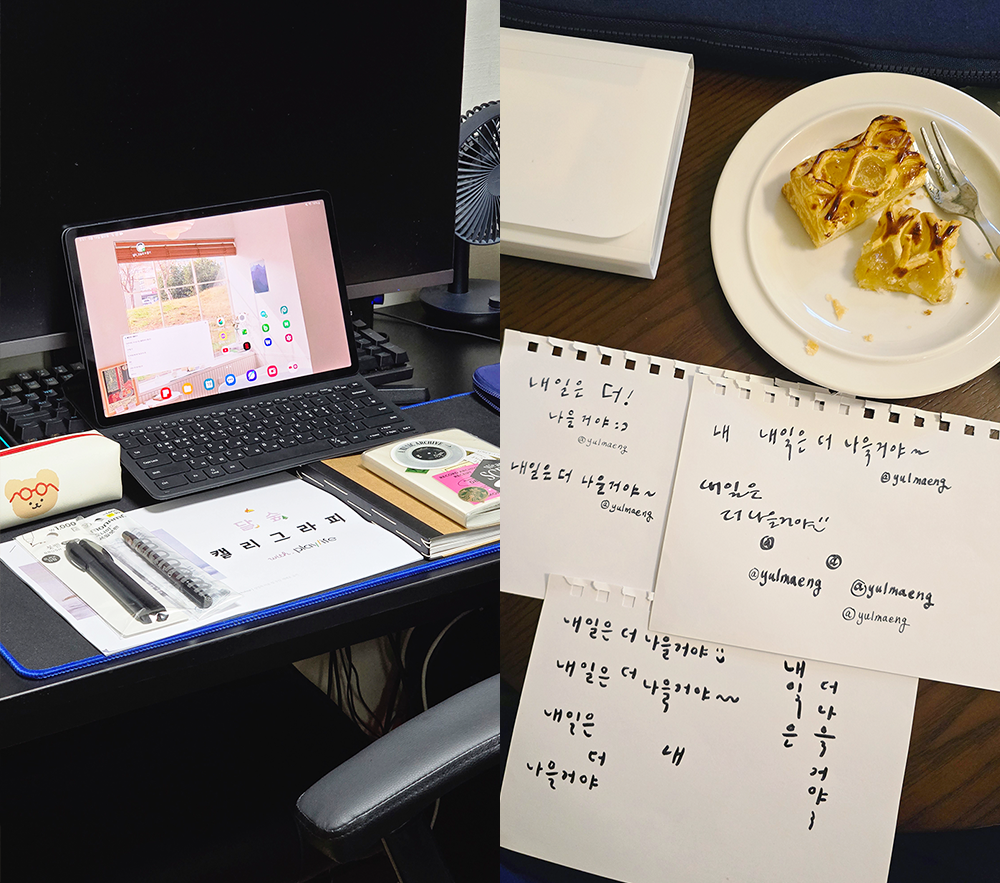 수업을 하면서 달숲 튜터님이 추천해주신 ‘조니 그린우드’의 ‘For The Hungry Boy’라는 음악이 기억에 남아요. “조용히 마음을 담아내는 시간에 오늘의 음악을 곁들여보세요”라는 말과 함께 소개해 주셨는데, 그 순간이 참 낭만적이었어요. 오늘의 음악과 함께 쓰는 캘리그라피라니! 그 조합 자체가 너무 따뜻하더라고요.