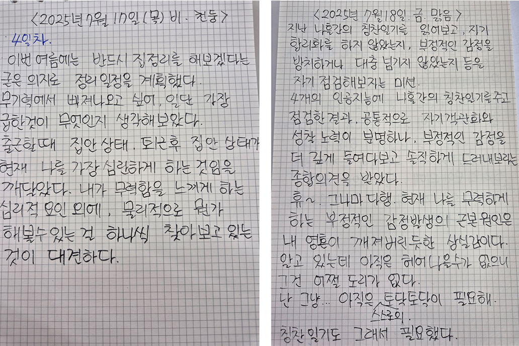 칭찬일기에 적은 저의 성취들과 스스로를 격려하는 노력이 ‘자기 치유의 도구’가 될 수 있음을 알게 되었어요. 늘 무언가를 ‘해야만 하는’ 존재였던 스스로에서, ‘해내고 있는 중인 나’를 인정해주니 마음이 조금 더 부드러워지기도 했고요.