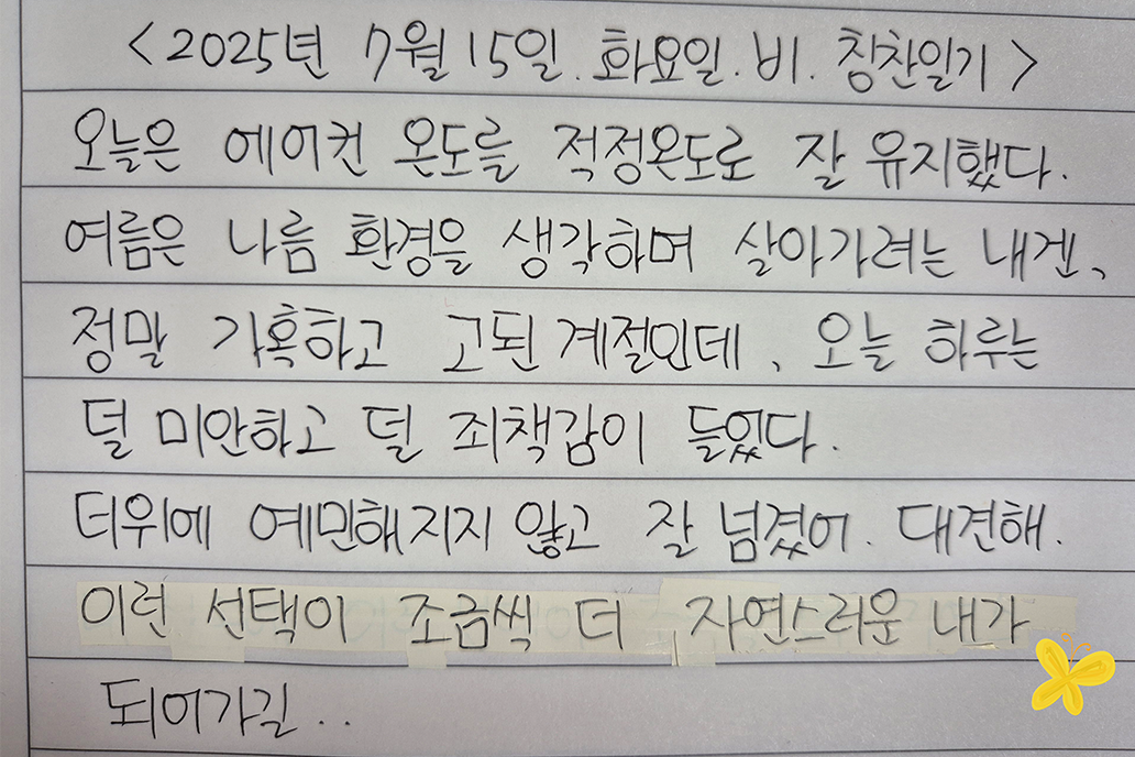 처음엔 칭찬일기를 쓰는 게 쉽지는 않았어요. 그래서 칭찬일기를 썼다기보다, TMI 일기를 쓰듯 찬찬히 썼다는 것에 만족합니다(웃음). 워크숍을 하면서 긍정적인 마음으로 스스로를 바라보는 것이 정말 소중한 시간임을 깨달았고, 스스로에게 ‘대견해’, ‘잘했어’라고 말하는 노력이 조금씩 저를 단단하게 만들고 있음을 느꼈어요. 무기력한 날에도 이유를 찾으려 애썼고, 일상의 작은 행동에도 의미를 부여하며 저를 북돋아 주었죠.